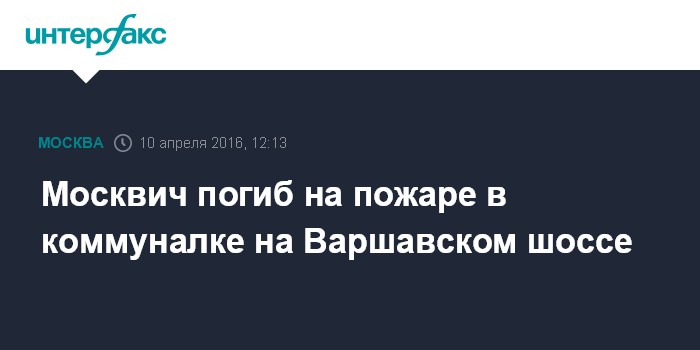 "По предварительным данным, рано утром 10 апреля в комнате коммунальной квартиры по Варшавскому шоссе в городе Москве произошло возгорание. В результате происшествия 42-летний житель столицы от полученных ожогов скончался на месте", - сообщила "Интерфаксу" старший помощник руководителя ГСУ СК России по городу Москве Юлия Иванова в воскресенье.
