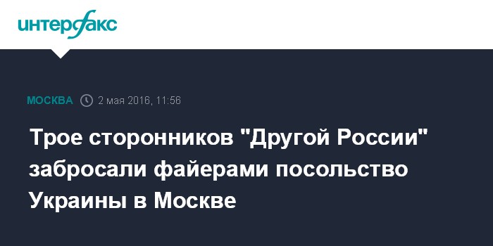По его словам, активисты "Другой России" забросали посольство Украины файерами и листовками. Акция была приурочена к событиям двухлетней давности в Одессе, когда произошли массовые беспорядки с человеческими жертвами.