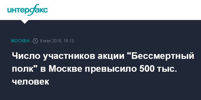 Москва. 9 мая. INTERFAX.RU - Уже более полумиллиона человек принимают участие в акции "Бессмертный полк" в Москве, сообщили "Интерфаксу" в пресс-центре МВД России.
