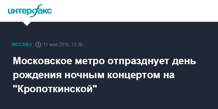 Москва. 11 мая. INTERFAX.RU - Традиционный ночной концерт, приуроченный к празднованию дня рождения Московского метрополитена, состоится в ночь на 14 мая на станции "Кропоткинская" Сокольнической линии, сообщили "Интерфаксу" в среду в пресс-службе подземки.