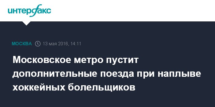 Москва. 13 мая. INTERFAX.RU - Столичный метрополитен подготовил к запуску дополнительные поезда в связи с проведением чемпионата мира по хоккею, который продлится в Москве до 22 мая.