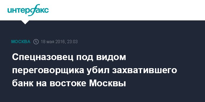 Москва. 18 мая. INTERFAX.RU - Захвативший отделение столичного банка мужчина был убит сотрудником группы спецназа, пришедшего под видом переговорщика, сообщил "Интерфаксу" источник в правоохранительных органах.