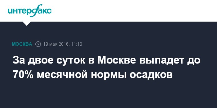 Москва. 19 мая. INTERFAX.RU - В столице с утра четверга до вечера пятницы местами может выпасть от 8 до 35 мм осадков, сообщили "Интерфаксу" в Гидрометеобюро Москвы и Московской области.