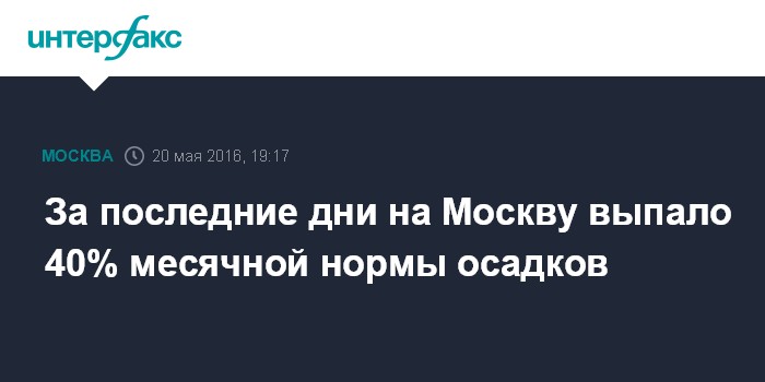Москва. 20 мая. INTERFAX.RU - По данным столичной метеостанции на ВДНХ к 18:00 пятницы в городе выпали 20 мм дождей, что составляет 40% от месячной нормы для мая, сообщили "Интерфаксу" в Гидрометеобюро Москвы и Московской области.