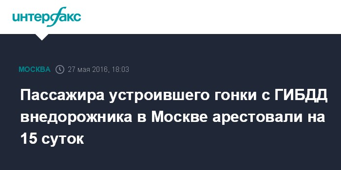 Москва. 27 мая. INTERFAX.RU - Гагаринский суд Москвы назначил 15 суток административного ареста пассажиру внедорожника "Мерседес Гелендваген", многократно нарушившему ПДД во время гонок по Москве, которые его пассажиры транслировали в интернет.