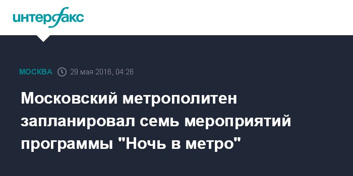 Москва. 29 мая. INTERFAX.RU - Следующее мероприятие программы "Ночь в метро" пройдет летом; всего до конца 2016 года планируется провести около семи таких мероприятий, сообщил пресс-секретарь начальника Московского метрополитена Андрей Кружалин