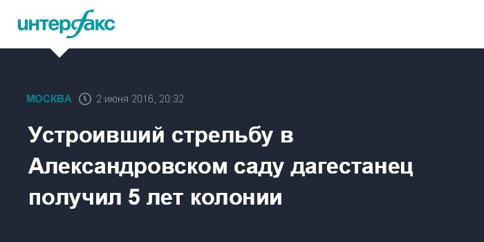 Москва. 2 июня. INTERFAX.RU - Тверской суд Москвы приговорил к пяти годам лишения свободы жителя Дагестана, устроившего стрельбу в Александровском саду.