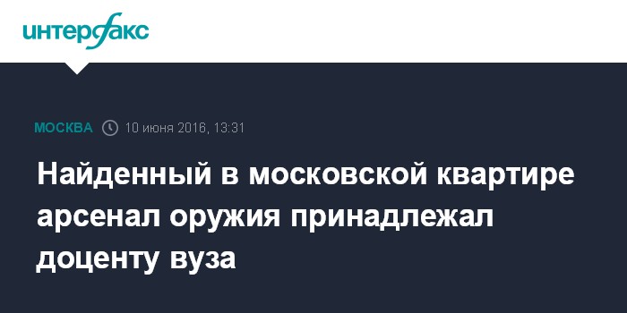 Москва. 10 июня. INTERFAX.RU - Владельцем арсенала оружия, обнаруженного в московской квартире, оказался доцент столичного вуза, сообщила "Интерфаксу" официальный представитель МВД России Ирина Волк.