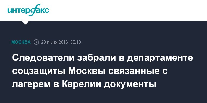 Москва. 20 июня. INTERFAX.RU -Представители следственных органов забрали в департаменте труда и соцзащиты Москвы документы, связанные с лагерем в Карелии, где погибли дети, сообщила замруководителя департамента Ольга Грачева.