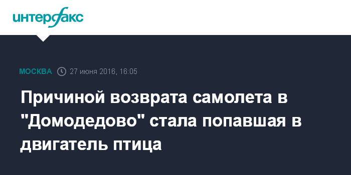 Москва. 27 июня. INTERFAX.RU - Отказ двигателя самолета авиакомпании "Ямал", вынудивший пилотов следовавшего в Мурманск воздушного судна вернуться в московский аэропорт "Домодедово", произошел из-за попадания в него птицы, сообщает пресс-служба авиакомпании.