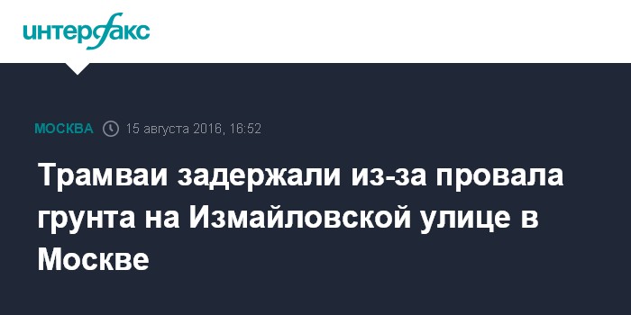 Москва. 15 августа. INTERFAX.RU - Трамваи на улице Измайловская на востоке Москвы задерживаются из-за провала грунта, сообщили "Интерфаксу" в понедельник в информационном центре столичного департамента транспорта и развития дорожно-транспортной инфраструктуры.