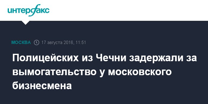Москва. 17 августа. INTERFAX.RU - В Москве задержаны участники организованной группы, в том числе двое сотрудники МВД по Чеченской республике, вымогавшие деньги у столичного предпринимателя, сообщила "Интерфаксу" в среду официальный представитель МВД Ирина Волк.