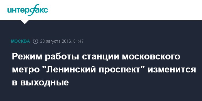 Москва. 20 августа. INTERFAX.RU - Режим работы станции "Ленинский проспект" столичного метро изменится в субботу и воскресенье в связи с проведением работ по интеграции объектов Московского центрального кольца, сообщили "Интерфаксу" в пресс-службе метрополитена в четверг.