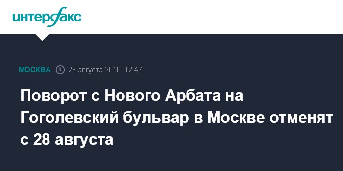 Москва. 23 августа. INTERFAX.RU - С воскресенья, 28 августа, будет отменен левый поворот на Гоголевский бульвар для автомобилей, следующих по Новому Арбату в сторону центра, сообщили "Интерфаксу" в Центре организации дорожного движения во вторник.