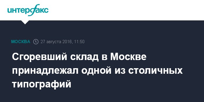 Москва. 27 августа. INTERFAX.RU - Склад на северо-востоке Москвы, где при пожаре погибли люди, принадлежит одной из столичных типографий, сообщил "Интерфаксу" источник в экстренных службах.