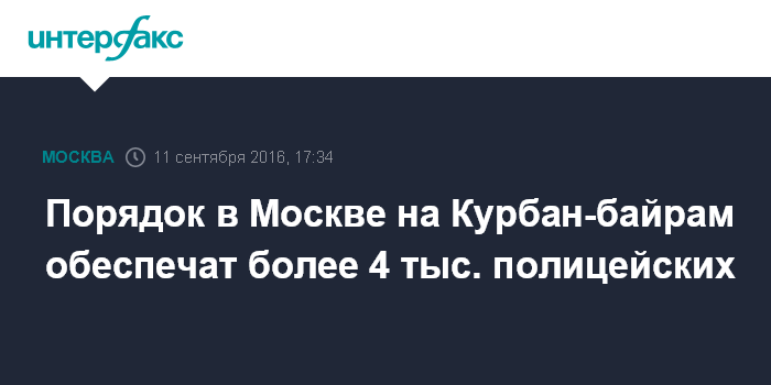 "12 сентября в Москве состоятся мероприятия по случаю одного из главных мусульманских религиозных праздников - Курбан-байрам. Более 4 тыс. сотрудников органов внутренних дел будет задействовано в обеспечении общественного порядка и безопасности в местах проведения мероприятий", - сказал сотрудник пресс-службы.