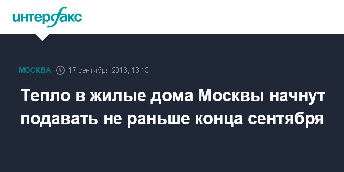 Москва. 17 сентября. INTERFAX.RU - Подача тепла в жилой сектор столицы с учетом погоды начнется не раньше конца сентября, сообщил журналистам заместитель мэра столицы по вопросам ЖКХ и благоустройства Петр Бирюков в субботу.