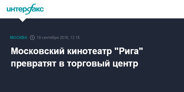 Москва. 19 сентября. INTERFAX.RU - Москомархитектура согласовала проект реконструкции кинотеатра "Рига" на Ботанической улице под торговый центр, сообщает в понедельник пресс-служба комитета.