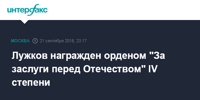 Москва. 21 сентября. INTERFAX.RU - Президент России Владимир Путин наградил бывшего мэра Москвы Юрия Лужкова орденом "За заслуги перед Отечеством" IV степени.