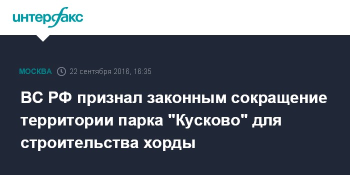 Москва. 22 сентября. INTERFAX.RU - Верховный суд РФ признал законным сокращение территории московского парка "Кусково" для строительства Северо-Восточной хорды.