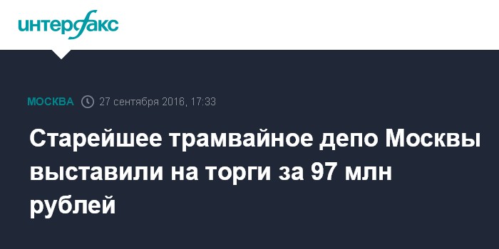 Москва. 27 сентября. INTERFAX.RU - Власти Москвы выставили на аукцион старейшее трамвайное депо города, стартовая цена лота составляет 97 млн рублей, сообщили во вторник в пресс-службе столичного департамента по конкурентной политике.