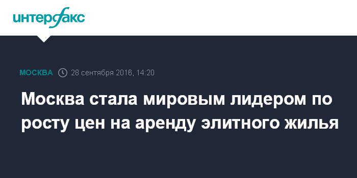 Москва. 28 сентября. INTERFAX.RU - Москва возглавила рейтинг мировых столиц по темпам роста стоимости аренды жилья высокого класса во втором квартале 2016 года, за год показатель в российской столице вырос на 11,1%, сообщается в среду в исследовании консалтинговой компании Knight Frank.
