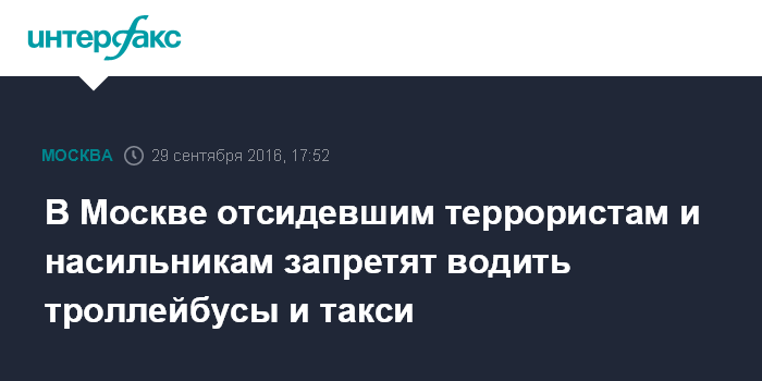 Москва. 29 сентября. INTERFAX.RU - Правительство Москвы выступит с инициативой запрета на работу на городском транспорте людей, судимых за тяжелые преступления против личности, сообщил заместитель мэра столицы по вопросам транспорта Максим Ликсутов.