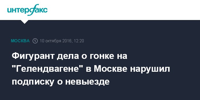 Москва. 10 октября. INTERFAX.RU - Виктор Усков, один из молодых людей, проходящий по делу гонки с полицией на "Гелендвагене" по улицам Москвы, нарушил подписку о невыезде, выяснилось в понедельник на заседании Гагаринского суда Москвы.