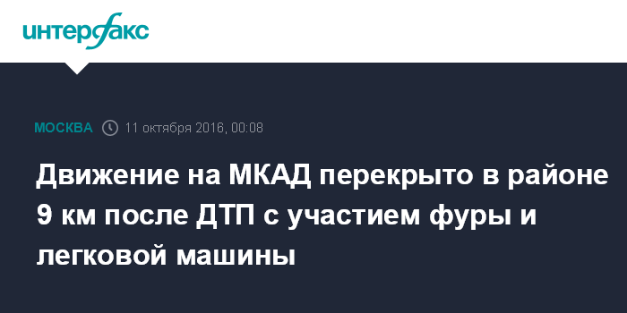 Москва. 11 октября. INTERFAX.RU - Движение на Московской кольцевой автомобильной дороге встало после аварии с участием фуры и легковушки, сообщил "Интерфаксу" во вторник источник в экстренных службах города.