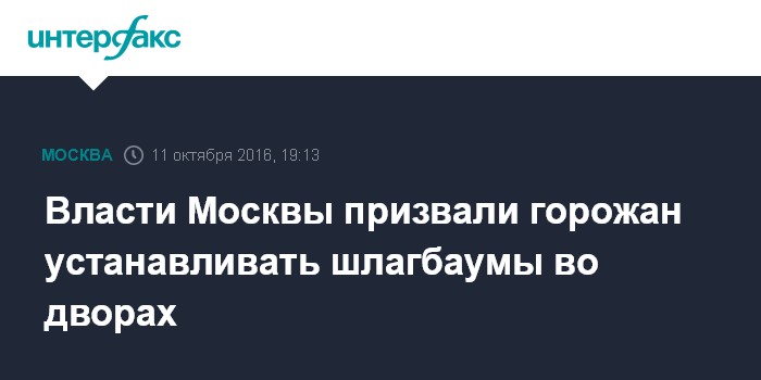 Москва. 11 октября. INTERFAX.RU - Заместитель мэра столицы Максим Ликсутов призвал москвичей активнее устанавливать шлагбаумы во дворах: только 10% парковок во дворах защищены шлагбаумами.