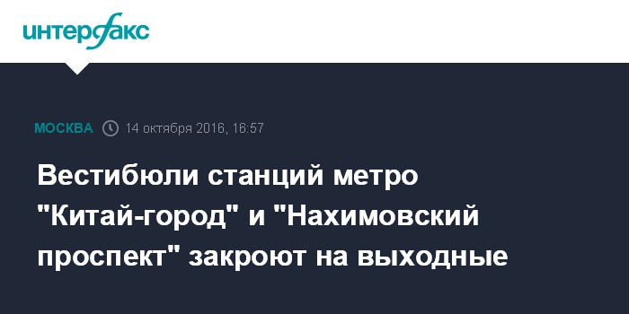 С 02:00 субботы до открытия метрополитена в понедельник для пассажиров будут закрыты северные вестибюли станций "Китай-город" и "Нахимовский проспект".