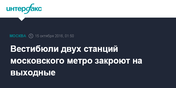 Москва. 15 октября. INTERFAX.RU - В рамках программы благоустройства в предстоящие выходные дни закроют вестибюли двух станций Московского метрополитена, сообщили "Интерфаксу" в пресс-службе подземки. С 02:00 субботы до открытия метрополитена в понедельник для пассажиров будут закрыты северные вестибюли станций "Китай-город" и "Нахимовский проспект". Кроме того, с 02:00 воскресенья до открытия метрополитена в понедельник будет закрыт эскалаторный павильон на станции "Пушкинская" (в здание "Известий").