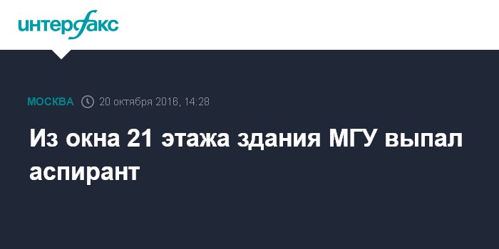 Москва. 20 октября. INTERFAX.RU - Выпавший из окна главного здания МГУ имени Ломоносова на Воробьевых горах молодой человек оказался аспирантом этого вуза, заявили в университете.