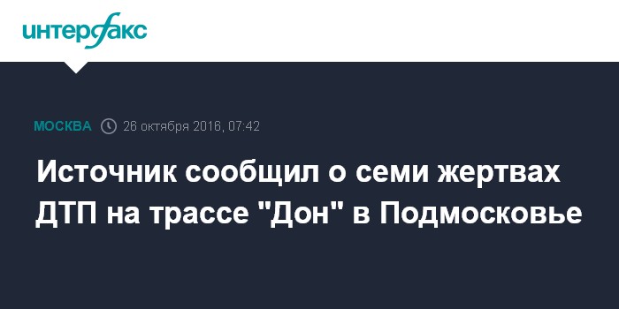 Москва. 26 октября. INTERFAX.RU - Число погибших в ДТП с участием двух фур под Москвой увеличилось до семи человек, сообщил "Интерфаксу" источник в экстренных службах.