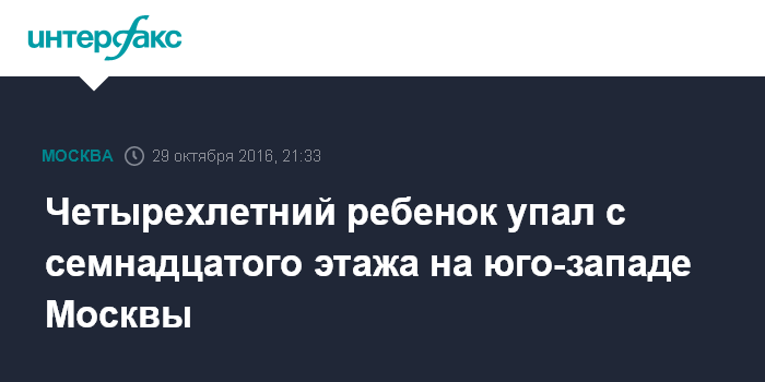 Москва. 29 октября. INTERFAX.RU - В результате падения с семнадцатого этажа на юго-западе Москвы скончался четырехлетний ребенок, сообщила официальный представитель столичного главка СКР Юлия Иванова.