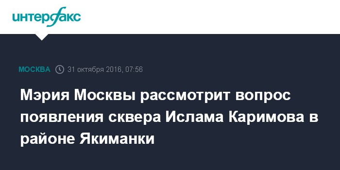 Москва. 31 октября. INTERFAX.RU - Проект постановления о присвоении столичному скверу имени первого президента Узбекистана Ислама Каримова будет рассмотрен на заседании правительства Москвы 1 ноября, сообщил официальный портал мэрии в понедельник.