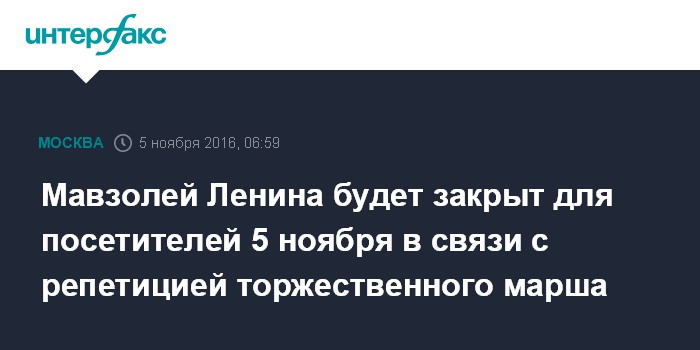 Как сообщает Центр по связям с прессой и общественностью ФСО РФ, "5 ноября допуск посетителей в мавзолей В.И.Ленина и к некрополю у кремлевской стены осуществляться не будет".