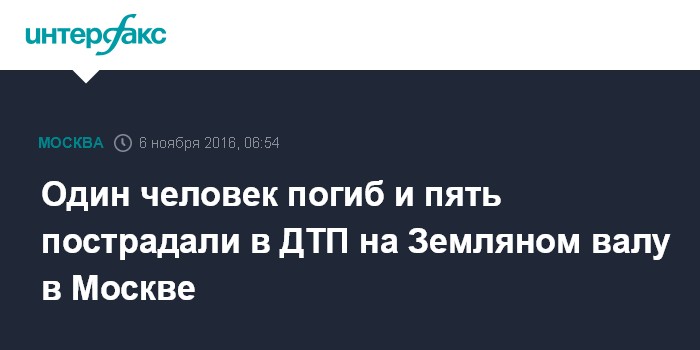 Москва. 6 ноября. INTERFAX.RU - Один человек погиб и пятеро пострадали в ДТП в центре Москвы, сообщил "Интерфаксу" источник в правоохранительных органах.