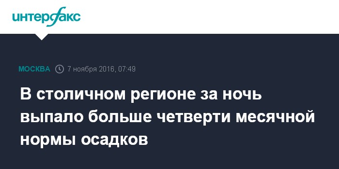 Москва. 7 ноября. INTERFAX.RU - В московском регионе с 16:00 воскресенья к 6:00 понедельника, по предварительным оценкам, выпало местами 17 мм осадков, сообщили "Интерфаксу" в столичном метеобюро.