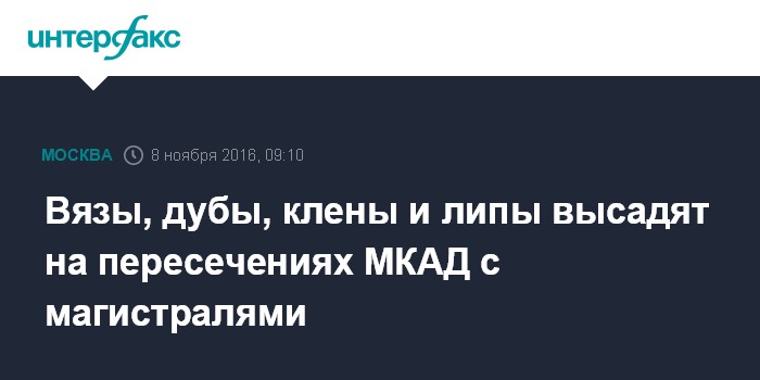 Москва. 8 ноября. INTERFAX.RU - Более 1,6 тыс. вязов, дубов, кленов и лип появятся на пересечениях МКАД с магистралями, сообщается во вторник на сайте мэрии Москвы.