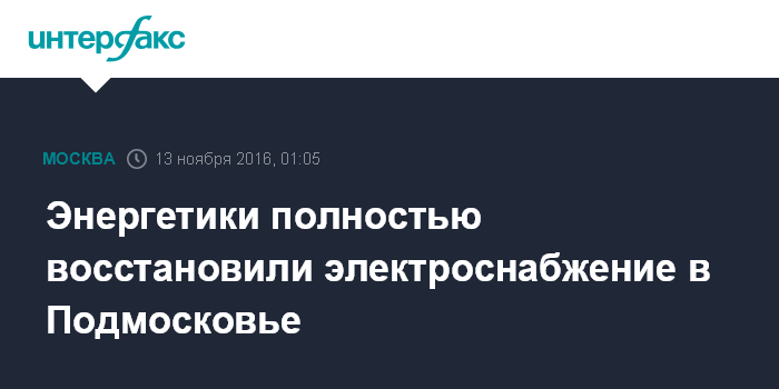 Москва. 13 ноября. INTERFAX.RU - Подача электроэнергии в Подмосковье осуществляется в полном объеме, сообщает МЧС.