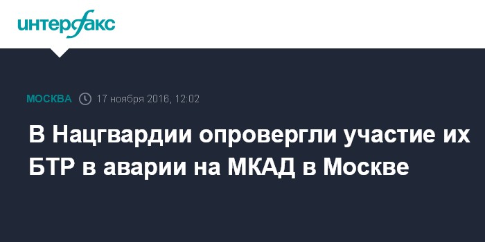Москва. 17 ноября. INTERFAX.RU - Бронетранспортер, столкнувшийся в четверг ночью с грузовиком на Московской кольцевой автодороге (МКАД), не принадлежит Росгвардии, сообщили в пресс-службе Центрального округа войск национальной гвардии.