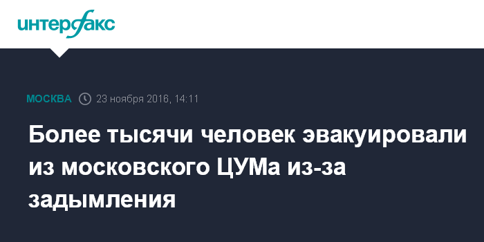 Москва. 23 ноября. INTERFAX.RU - В ходе эвакуации из здания Центрального универсального магазина в Москве из-за задымления выведено более тысячи человек, сообщили "Интерфаксу" в пресс-службе столичного главка МЧС.