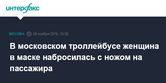 Москва. 29 ноября. INTERFAX.RU - Полиция задержала вооруженную ножом женщину в маске, набросившуюся на пассажира в салоне троллейбуса, сообщили "Интерфаксу" во вторник в пресс-службе столичного главка полиции.