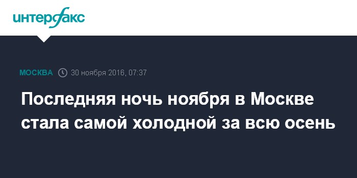 Москва. 30 ноября. INTERFAX.RU - Последняя ночь ноября в столичном регионе стала самой холодной за всю осень 2016 года, сообщили "Интерфаксу" в Гидрометеобюро Москвы и Московской области в среду.