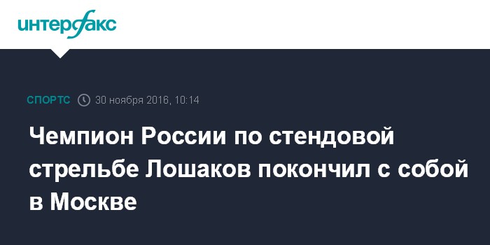 Москва. 30 ноября. INTERFAX.RU - Спортсмен Владимир Лошаков покончил с собой в Москве, сообщил "Интерфаксу" источник в правоохранительных органах.