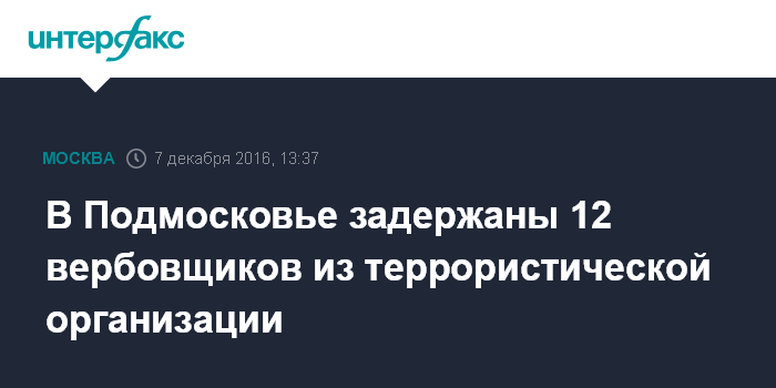 Москва. 7 декабря. INTERFAX.RU - На территории московского региона задержаны 12 участников террористической организации, вербовавших граждан в ряды запрещенной в РФ группировки.