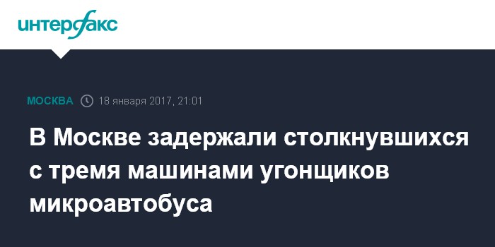 Москва. 18 января. INTERFAX.RU - Сотрудники московской полиции задержали двух мужчин, подозреваемых в угоне микроавтобуса "Соболь", на котором они устроили аварию с тремя автомобилями в центре города, сообщила "Интерфаксу" официальный представитель МВД РФ Ирина Волк.