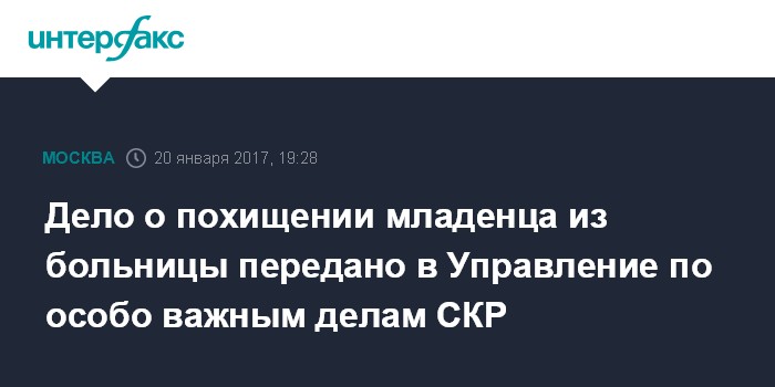 Москва. 20 января. INTERFAX.RU - Делом о похищении в 2014 году ребенка из подмосковной больницы займется Управление по особо важным делам Следственного комитета России. Об этом говорится в сообщении, размещенном на сайте следственного управления СКР по Московской области.