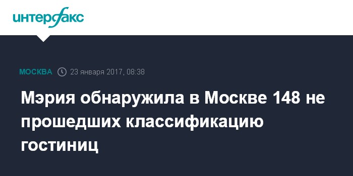 Москва. 23 января. INTERFAX.RU - Департамент спорта и туризма столицы в январе выявил 148 "серых" гостиниц и хостелов, которые не прошли классификацию накануне Чемпионата мира по футболу 2018 года, но продолжают размещать объявления о бронировании, сообщает официальный портал мэрии.